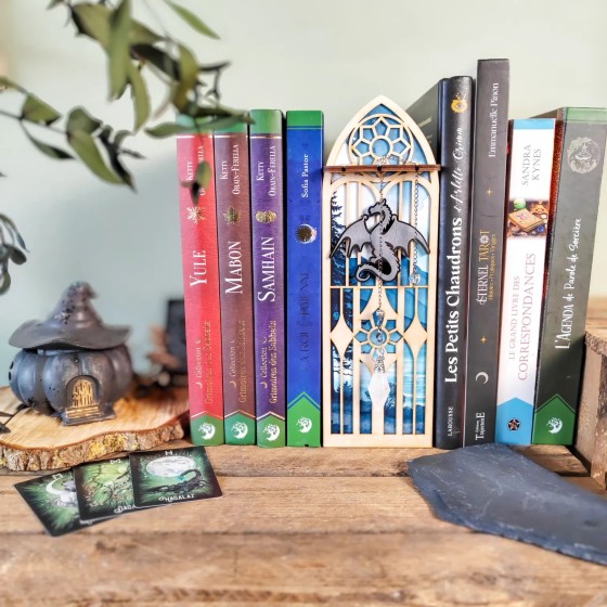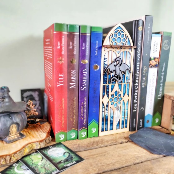Et si ta bibliothèque devenait un véritable espace de rituel ? Une fenêtre gothique, un dragon en plein envol tel un veilleur...