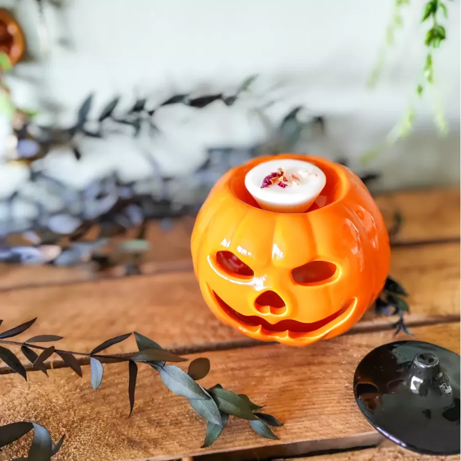 Dépose un fondant dans la coupelle, allume ta bougie chauffe-plat et laisse la citrouille s’illuminer doucement. Observe les ombres danser et les parfums se répandre : c’est l’automne qui murmure à ta porte
