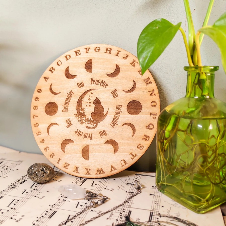 ✔ Gravure : alphabet complet et chiffres (0 à 9), Cycle lunaire, quart de lune fleuri avec chat - Indications ("oui", "non", "peut-être", "reformuler") inscrites en cercle pour guider vos réponses
