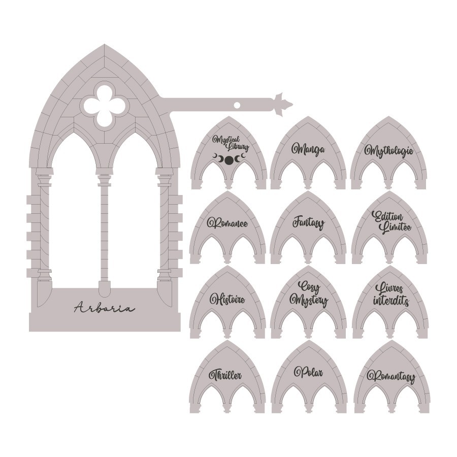 Inspiré des arches anciennes et des bibliothèques secrètes, ce séparateur de livres transforme ton étagère en lieu de passage entre les mondes.