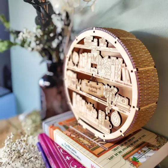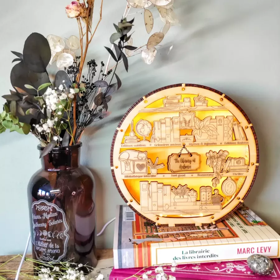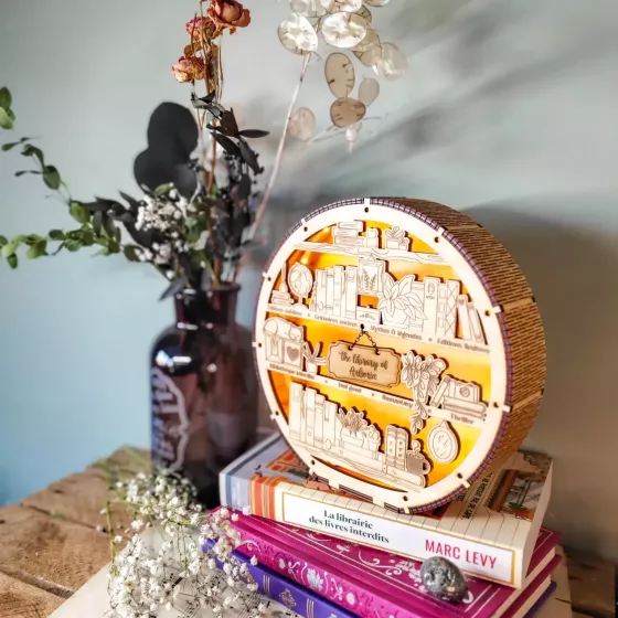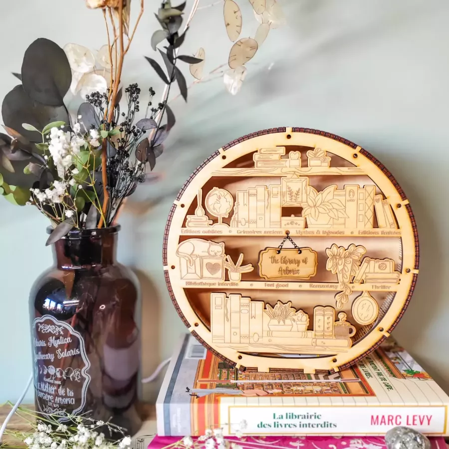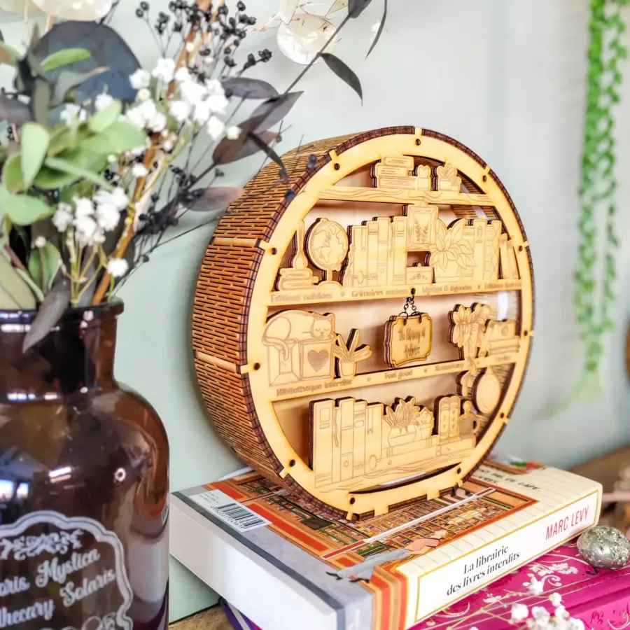 Inspirée des cabinets de curiosités et des bouquineries anciennes, cette création représente une étagère remplie de livres, d’objets délicats et de détails narratifs. En son cœur, une petite enseigne suspendue, personnalisée avec le nom de ton projet, de ta bibliothèque rêvée ou de ton coin lecture.