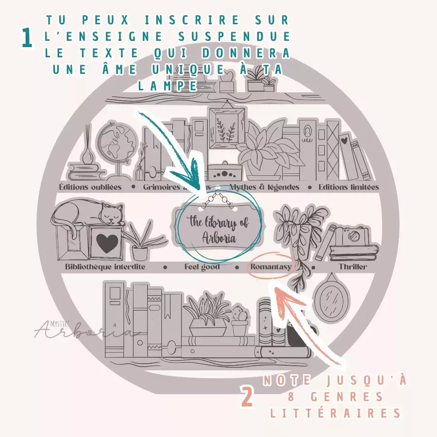Tu peux personnaliser jusqu’à 2 bordures d’étagère, avec 2 à 8 genres littéraires au total.